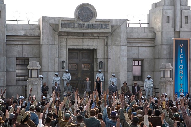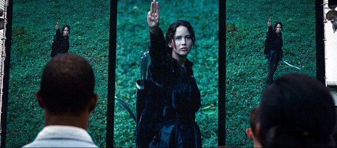 하지만 캣니스는 1~12구역을 순회 연설을 하던 중 헝거게임에서 자신을 도와주고, 자신을 대신해서 죽었던 루의 고향을 방문하게 되는데, 루에 대한 깊은 애정때문이였는지 캣니스는 윗 장면과 같이 사람들을 따라 죽은 루에 대한 조의 표시를 보내게 되었고 스노우 대통령이 원하던 방향과 다르게 또 다시 반란의 불꽃을 키우게 된다.